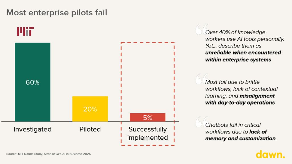 The harsh truth is that a lot of enterprise AI never makes it past the pilot stage. As an MIT Ananda study points out, there is an unfortunate funnel where 60% of projects are investigated, 20% are piloted, and only 5% are successfully implemented. The reasons cited for this are telling: brittle workflows, lack of contextual learning, and misalignment with day-to-day operations. Even when knowledge workers use AI personally, they often describe it as unreliable inside enterprise systems.