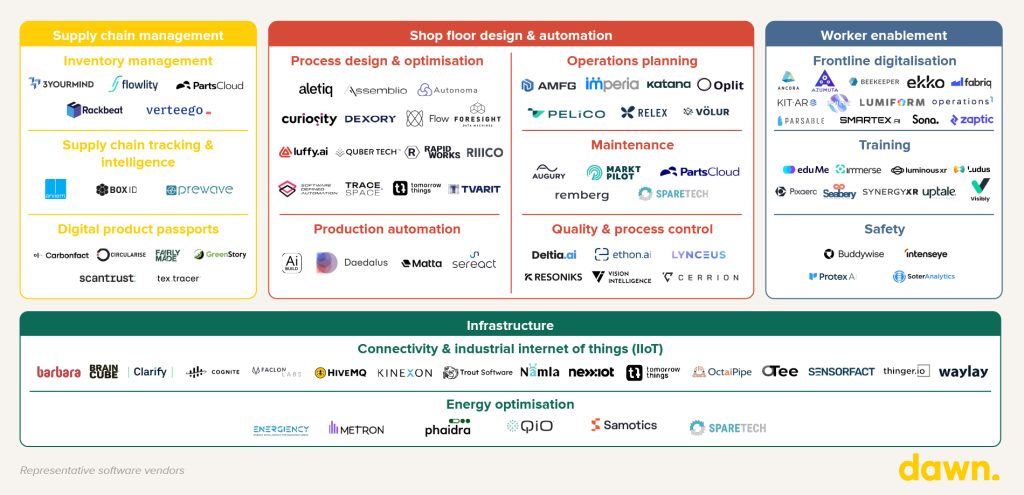 The companies in the above market map are addressing inefficiencies across the manufacturing process, and paving the way for the digital transformation of the factory. We’re delighted to see this breadth and depth of innovation across the continent and are interested in hearing from companies in this space. If you’re a founder looking for support, please get in touch with: evgenia@dawncapital.com, daniela@dawncapital.com  and skye@dawncapital.com.