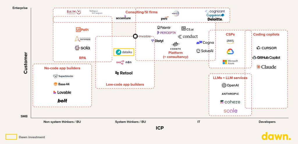 Platform-plus-services players (for example Palantir, Distyl, Invisible Technologies, Cogna, SolveAI, Conduct) compete on their ability to translate enterprise complexity into deployed outcomes, not just developer productivity. At the same time, the lower-context end of the market will keep expanding via copilots, no-code builders and agent builders, because prototyping is now essentially free.