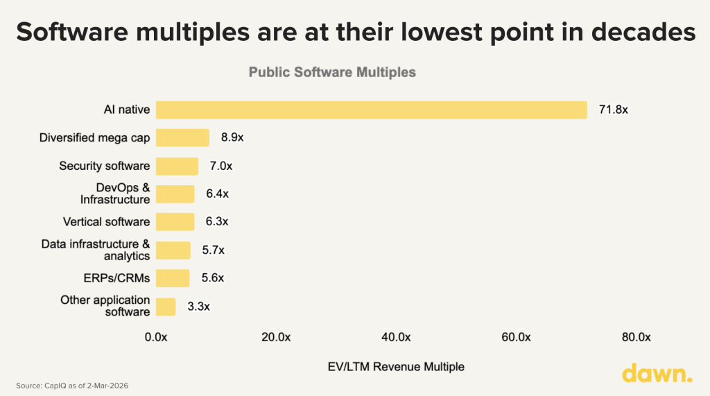 You’d have to be paying no attention not to have seen the recent repricing in publicly listed software companies. Investors have dumped a trillion dollars in value across multiple software names and sectors, and many have begun to reckon with a more uncomfortable idea: the terminal value of classic SaaS might look radically different in a world where generative AI can increasingly do the work, rather than merely help humans do it. As a result, software is trading at an average multiple of ~6x EV/LTM Revenue, vs~20x in 2021, a 70% compression. Horizontal software has been hardest hit, compressing to ~3x multiples.