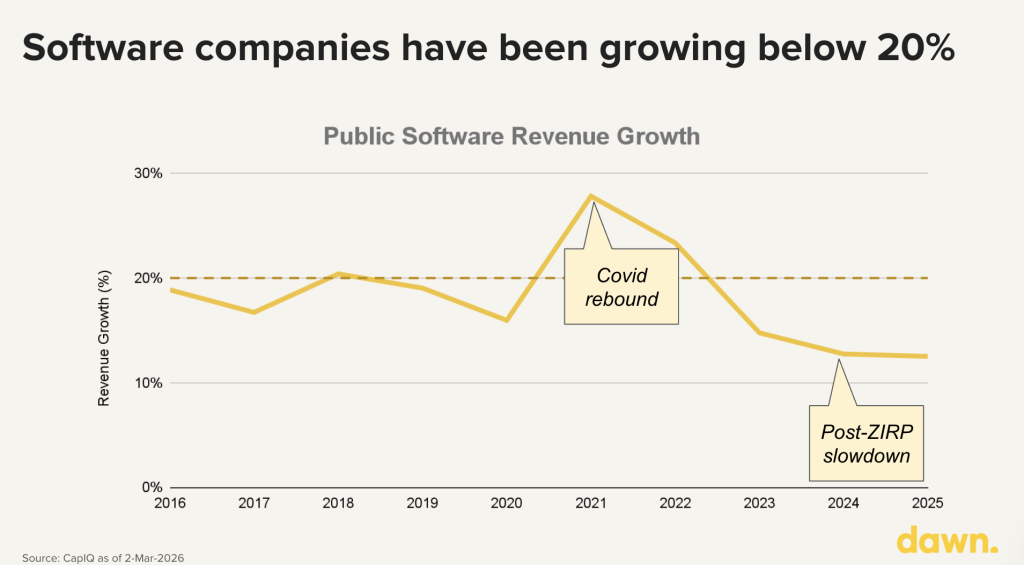 We’ve been investing in enterprise software since 2007 and today have a portfolio of almost 100 software companies. For us, software, and SaaS in particular, has been a fantastic asset class. It grew at roughly ~20% YoY for the last two decades, and it did so with economics that were unusually attractive: low churn, high gross margins, and the ability to grow with customers over time. However, while SaaS has historically grown at ~20%, it is now growing at ~12% – an 8 percentage point decline. It’s also important to note that a lot of that slowdown began before any recent AI catalyst became an easy headline.