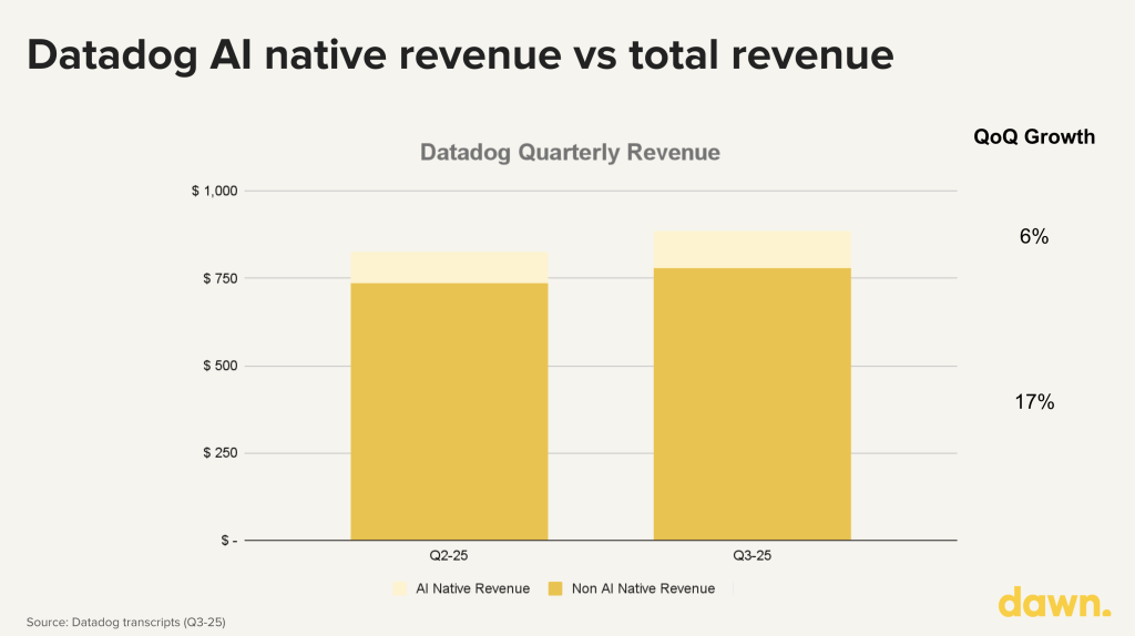 Even public market leaders like Datadog and ServiceNow, who are ruthlessly rolling out new products, have not seen significant topline expansion yet. In the case of Datadog, some of the growth has come from AI-native customers themselves. Datadog cites 12% of their revenue as AI native (and growing 17% QoQ and up from 6% 18 months ago), and ServiceNow’s AI product – Now Assist – now has $600m of ARR. However, AI revenues remain small versus broader revenues at many incumbents, so it is hard to see that growth shine through immediately in the top line.